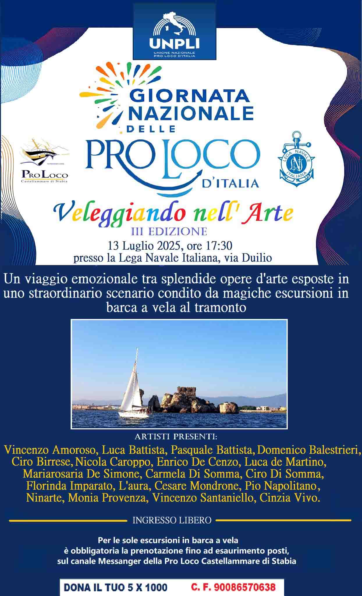 Castellammare di Stabia si prepara a festeggiare in grande stile la Giornata Nazionale delle Pro Loco d’Italia, domenica 13 luglio 2025, con un evento unico che coniuga arte, mare e amore per il territorio. La Pro Loco locale, in sinergia con la sezione di Castellammare di Stabia della Lega Navale Italiana, presenta la terza edizione di “Veleggiando nell’Arte”, una manifestazione che promette di regalare emozioni e scoperte a cittadini e visitatori. Una galleria d’arte a cielo aperto prenderà vita negli splendidi spazi della sede della Lega Navale Italiana, in via Duilio. Numerosi artisti del territorio esporranno le loro opere, trasformando la location in un suggestivo percorso espositivo con il mare a fare da incomparabile cornice.Un’occasione per ammirare la creatività e il talento locale in un contesto del tutto eccezionale. Ma le sorprese non finiscono qui. Grazie alla disponibilità di diverse imbarcazioni a vela, i partecipanti avranno l’opportunità unica di circumnavigare il golfo di Castellammare. La veleggiata condurrà i visitatori fino al suggestivo “Scoglio di Rovigliano”, un piccolo isolotto carico di storia e leggende, che si erge solitario nelle acque del golfo.