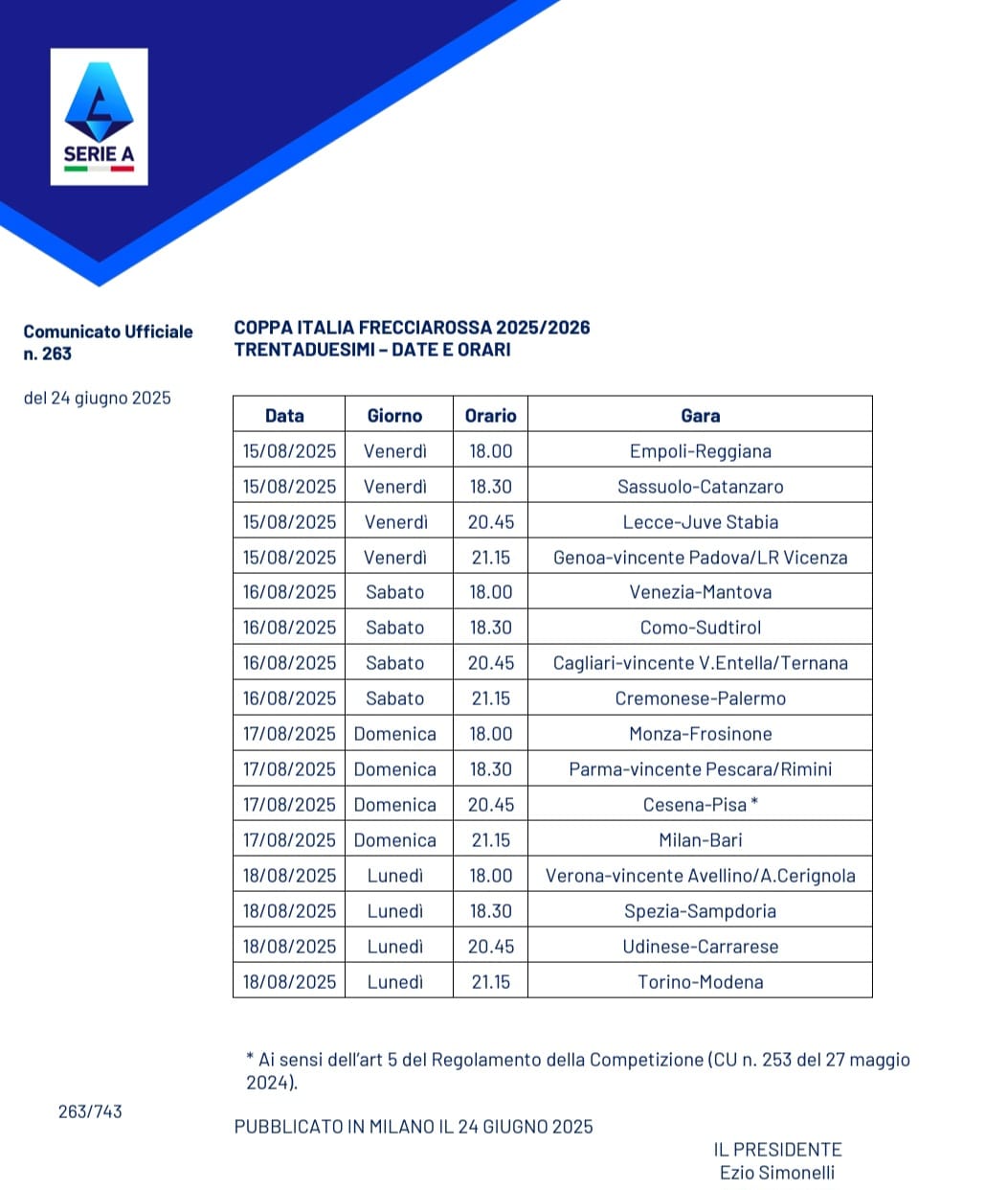 Di seguito, il quadro completo di tutte le altre partite dei 32esimi di finale della Coppa Italia Frecciarossa 2025-2026: