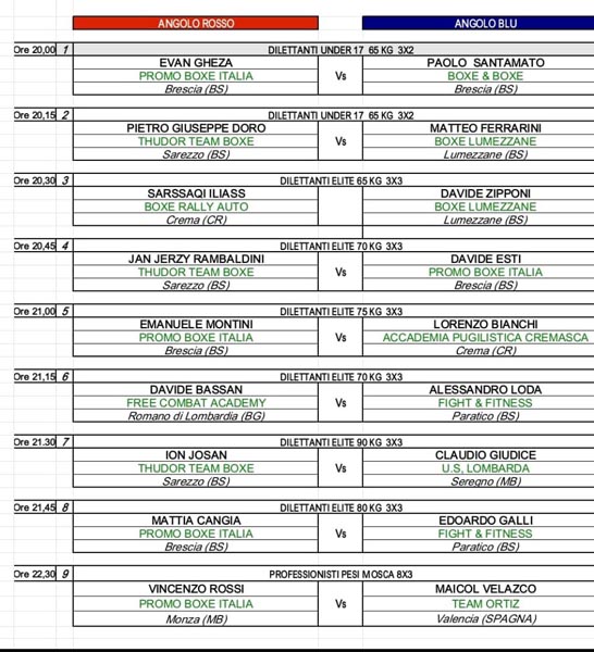 La serata prevede otto match dilettantistici prima del gran finale: un incontro professionistico sulla distanza delle 8 riprese tra il peso mosca Vincenzo Rossi (Promo Boxe Italia Promoter Mario Loreni )residente a Monza, e lo spagnolo Maicol Velazco (Team Ortis).Anche quest’anno il Memorial Gino Uberti vuole rendere omaggio al generoso uomo di sport che ha sempre sostenuto con passione le discipline locali, in particolare il pugilato.