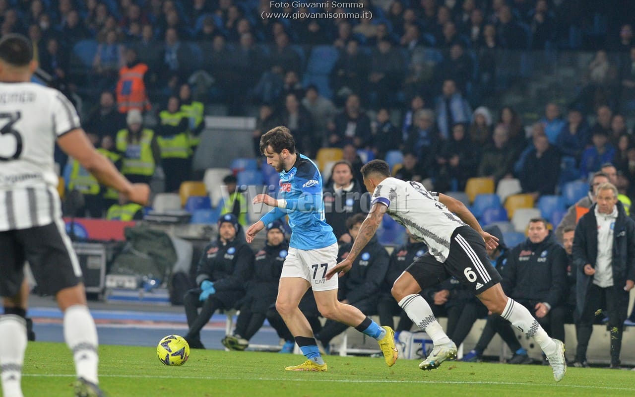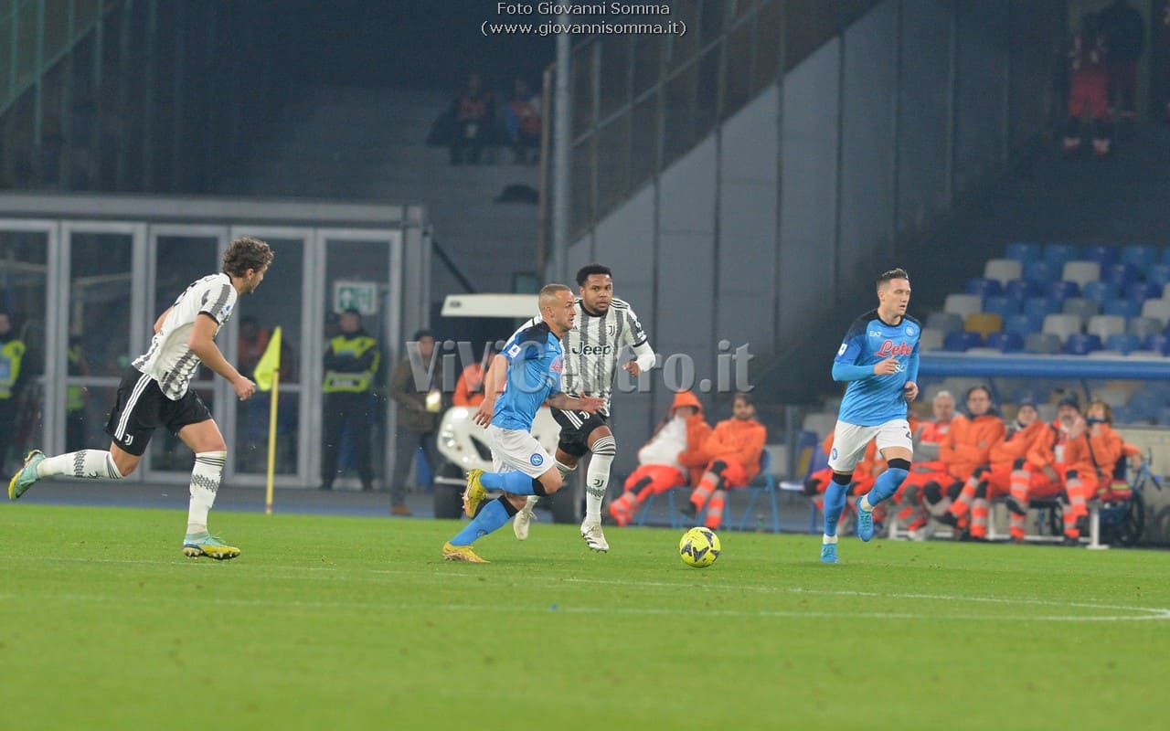 I partenopei non si fermano più, al settantunesimo Elmas salta Alex Sandro e calcia verso la porta, trova la deviazione di Bremer che beffa l’estremo difensore polacco ed è 5-1 Napoli!