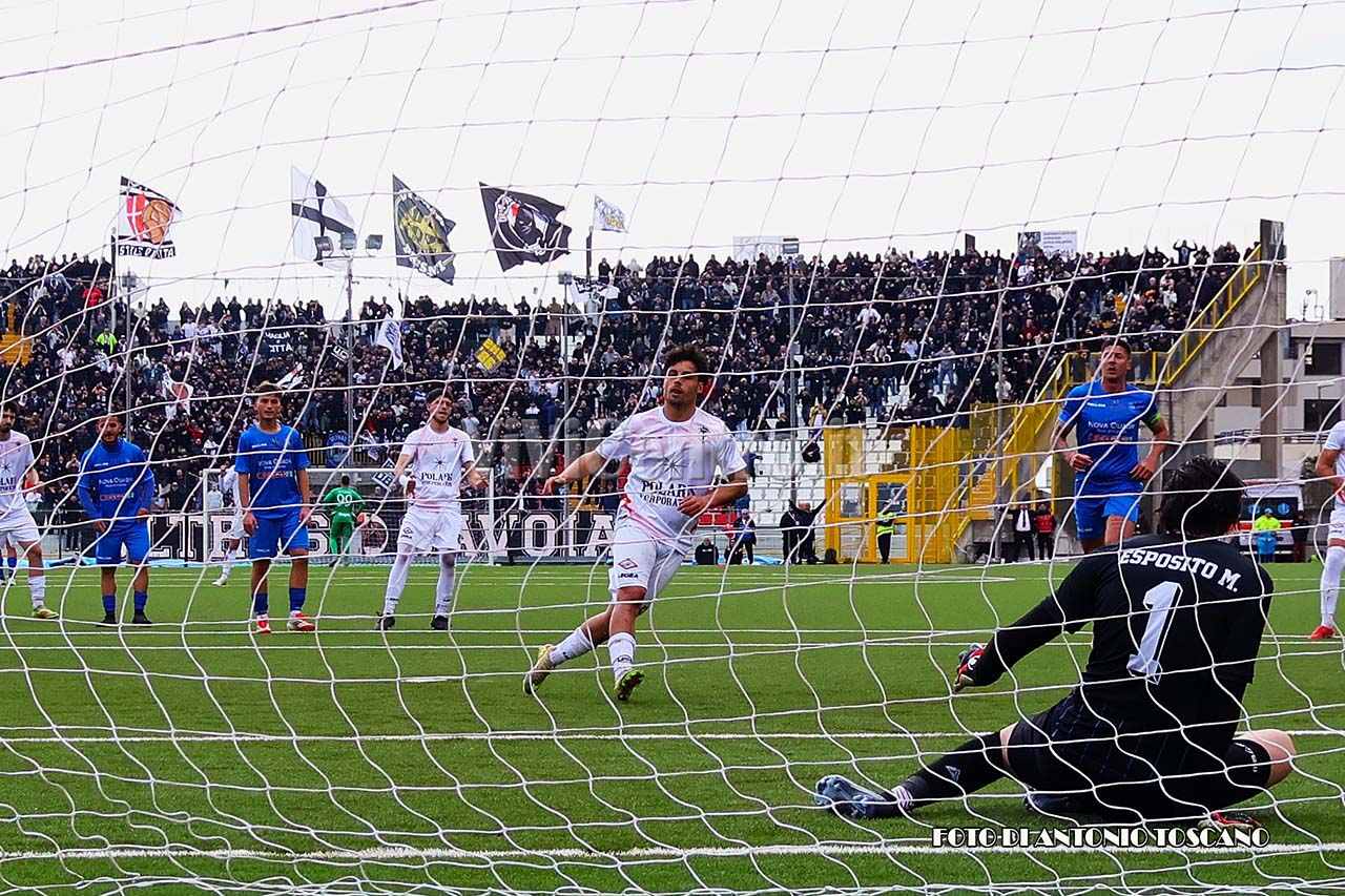 Una gara a senso unico, dominata dal primo all’ultimo minuto, che si apre con una grande occasione di Schiavi che al 10′ sfiora il gol sugli sviluppi di una rimessa laterale di Cadili, con torre di Nussbaumer e conclusione respinta da Esposito. Poco dopo calcio di rigore per il Savoia, trasformato da Guida, è l’1-0.