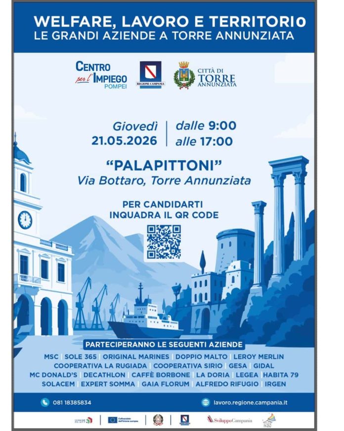 L’evento è promosso in sinergia tra il Comune di Torre Annunziata e il Centro per l’Impiego di Pompei, con la co-organizzazione dell’Ambito Territoriale n° 30 e della Direzione Lavoro e Formazione Professionale della Regione Campania.